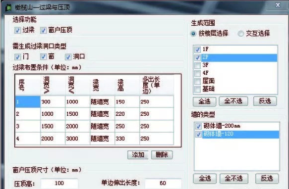 根据设计说明设置梁高及墙上搁置长度(下图左侧部分设置),可根据个人需求设置生成范围,两种选择方式:按楼层选择(批量创建时可选择此选项),交互选择(仅少量局部创建或修改时可选择此项)。下图为批量设置时选择示意。